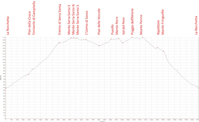 ITINERARIO: La Rocchetta q.534 (Alla nostra destra c’è la grande fonte, l’area pic-nic e il rifugio incustodito di fianco al quale inizia il sentiero CAI 210 che sarà il nostro ritorno, iniziamo seguendo la strada asfaltata interdetta al transito oltrepassando gli stabilimenti abbandonati) – Bivio q.581 (Bivio della stradina e innesto sul CAI 208: a sinistra è via Santo Marzio, andiamo dritto in salita sulla via della Rocchetta costeggiando le vistosi reti paramassi) – Bivio q.592 (A sinistra c’è la sterrata chiusa da sbarra CAI 213 per l’eremo di Santo Marzio, rimaniamo sulla stradina asfaltata CAI 208 superando una piazzola con presa d’acqua situata alla nostra destra) – Sorgente della Rocchetta q.610 (Termina la stradina asfaltata, sulla destra ci sono degli edifici dismessi e un piccolo bacino, il CAI 208 ora continua su sentierino di ghiaia, facciamo attenzione che dopo pochi metri curva a gomito a sinistra tra cespugli di ginestre) – Area pic-nic q.675 (Piazzola pic-nic e palestra di roccia, continuiamo sul sentiero CAI 208 parallelo al torrente asciutto dove notiamo delle tubazioni) – Piazzola q.758 (Slargo del sentiero che precede l’arrivo a Pian della Croce) – Pian della Croce q.765 (Quota da GPS, biforcazione e cartelli: a destra continua come CAI 214/CAI 216 per Poggio Campanella e Valle del Pero, stiamo sul CAI 208 che curva a sinistra e si alza sopra una presa d’acqua) – Bivio q.775 (Appena risaliti dalla presa d’acqua di Pian della Croce, rimaniamo in salita sul CAI 208 e tralasciamo sulla destra una traccia comunque poco evidente per la grotta di Frate Fava) – Fontanile di Campitella q.878 (Al termine del lungo muretto del fontanile riprende il sentiero) – Bivio q.883 (Dopo un minuto avere lasciato il fontanile, rimaniamo sul CAI 208 che curva a destra in salita, dritto inizia un sentiero non segnato destinato ad attraversare il fosso di Campitella e successivamente a reinnestarsi sul CAI 208) – Curva q.957 (Il sentiero che saliva con direzione NE, in questo punto quotato 957 m da IGM Umbria curva a gomito a sinistra e continua a mezzacosta, direzione ovest) – Balza di Mezzogiorno q.1077 (Località Balza di Mezzogiorno, il punto è quotato 1077 m da IGM Umbria. Uscendo dalla vegetazione gli spazi si aprono e il terreno è cosparso da affioramenti di pietre, il sentiero diventa confuso. Dal fondovalle alla nostra sinistra proviene il sentiero basso che iniziava dopo il fontanile di Campitella, allo stato attuale non lo si percepisce e non vi sono indicazioni, il nostro CAI 208 sale a destra nel vasto pendio erboso evidenziato da sporadici omini di sasso verso il soprastante crinale, direzione N) – Balza di Mezzogiorno q.1127 (Località Balza di Mezzogiorno, il punto è quotato 1127 m da IGM Umbria. Salendo il pendio erboso andiamo a intercettare d’obbligo il sentierino a mezzacosta che attraversa il crinale SO del monte Serra Santa, cartelli: a destra il sentiero conduce alla località Selvolina, a sinistra è CAI 215 per la Valsorda, attraversiamo il sentiero e continuiamo in ripida salita iniziando di fatto il crinale SO del monte Serra Santa che è CAI 224, indicazioni per l’eremo) – Bivio q.1315 (Siamo in vista della croce dell’eremo di Serra Santa quindi rimaniamo sul crinale per raggiungerlo, a sinistra inizia una traccia a mezzacosta che si direziona verso il grande parcheggio delle autovetture) – Eremo di Serra Santa q.1348 (Superiamo l’eremo e percorriamo la sua carrozzabile d’accesso che si mantiene sempre sul crinale) – Incrocio q.1371 (La carrozzabile curva a gomito a sinistra e scende puntando al grande parcheggio, sulla destra c’è il largo Sentiero Italia SI che si sviluppa a mezzacosta nel versante meridionale del monte Serra Santa, andiamo dritto in salita sull’ampio pendio inizialmente su largo percorso, poi su traccia poco definita nel manto erboso, siamo sul CAI 207, segni assenti) – Monte Serra Santa S q.1423 (Arriviamo sul vasto pianoro erboso, è la cima meridionale del monte Serra Santa e malgrado sia il punto più alto è anonimo e privo di indicazioni, svoltiamo a sinistra procedendo sul CAI 207 senza percorso obbligato e puntando all’evidente cima nord) – Monte Serra Santa N q.1421 (Dal grande omino di sassi è stata realizzata una nicchia con cancello metallico che racchiude la statua della Madonna, torniamo sui nostri passi) – Monte Serra Santa S q.1423 (Ora avanziamo a vista con direzione sud nelle vaste praterie sommitali perdendo quota) – L’Uomo di Sasso q.1391 (Ci innestiamo sul largo percorso Sentiero Italia, come detto in precedenza si sviluppava a mezzacosta e ora raggiunge il nostro crinale. Avanziamo sul tratturo che passa tra i punti alti dell’Uomo di Sasso, quello alla nostra sinistra quotato 1389 metri, e quello alla nostra destra di 1391 metri, entrambi anonimi e privi di segnalazioni. Solo per curiosità li guadagniamo entrambi ma possiamo tenerci sul tratturo che spostandosi a destra a mezzacosta perde quota, di fatto puntiamo verso l’aguzza cima del monte Penna visibile in lontananza) – Pian delle Vescole q.1281 (Il tratturo Sentiero Italia compie un ampio giro e continuando a perdere quota si riporta sul crinale nella vasta depressione erbosa del versante nord occidentale del monte Purello. Seguendo il sentiero nell’ampio crinale cominciamo a salire verso quest’ultima cima, segni sporadici) – Bivio q.1325 (Il Sentiero Italia si sposta a destra e ora procede a mezzacosta tenendosi sotto il crinale per bypassare le cime, noi lo lasciamo e continuiamo a salire su traccia di passaggio, cartelli e indicazioni assenti, direzione SE) – Cima q.1342 (Dal bivio precedente in pochi minuti guadagniamo la cima anonima, senza toponimo e quotata 1342 m da IGM Umbria, continuiamo a seguire il crinale in continua ascesa virando naturalmente a destra) – Purello q.1405 (Al culmine della salita siamo sul Purello, anonimo e privo d’indicazioni, lo riconosci